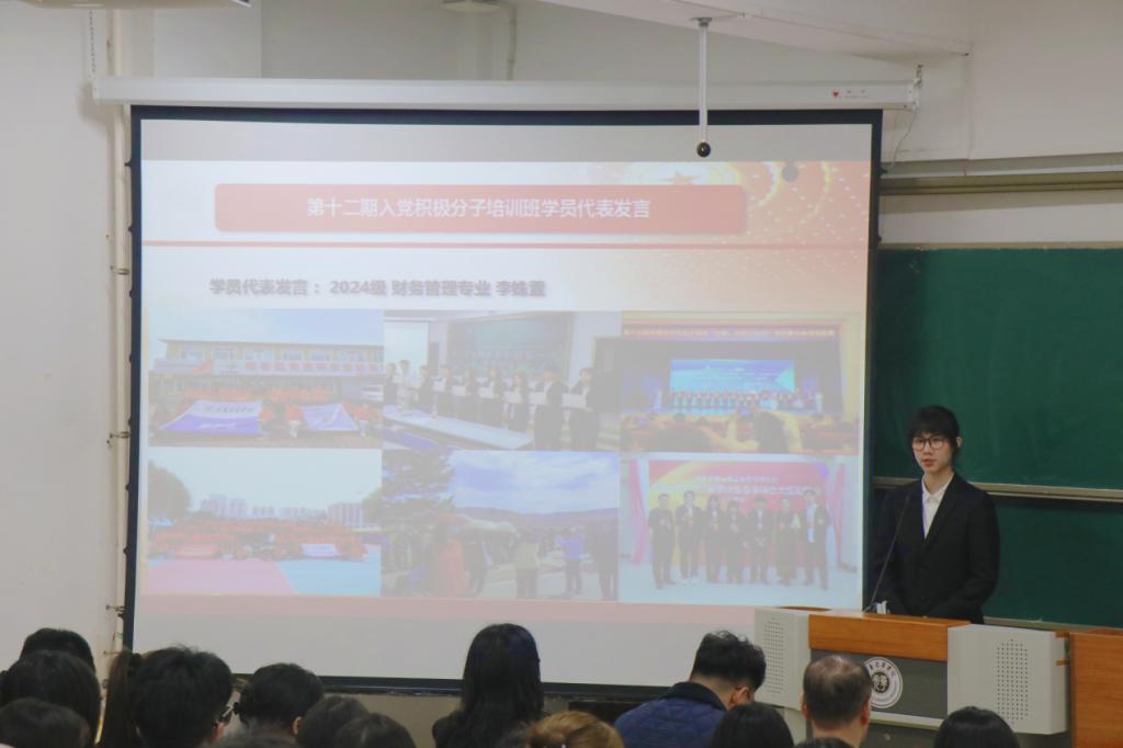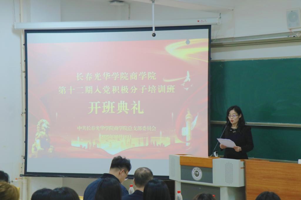 为深入学习贯彻习近平新时代中国特色社会主义思想,传承红色基因、凝聚青年力量,充分发挥党组织的思想引领作用,进一步提高学生的思想政治觉悟,紧扣“思政教育提质、学风建设强化”核心指标,为学校高质量通过考核评估筑牢支撑。长春光华学院商学院于10月16日在第二教学楼212教室开展第十二期入党积极分子培训班开班仪式暨党课第一讲,商学院党总支副书记王皓田、学生第二党支部书记王莹出席。