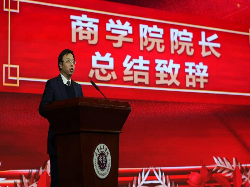 最后,商学院院长周佰成作总结讲话。他指出,商学院始终以培养“既能扎根专业、又能对接产业”的高素质财经人才为目标,坚持以“赛事+课程+产业”作为育人核心路径。未来,学院将持续整合资源、升级实践平台,强化校企协同,为学子提供更多理论转化为实战的机会,助力学子实现人生价值,为区域经济发展贡献青春力量。