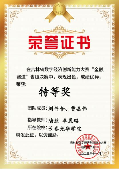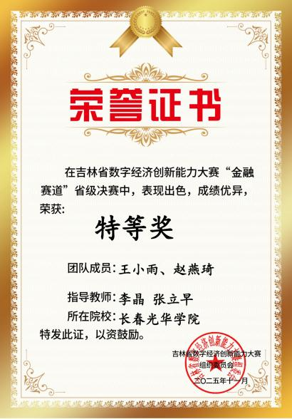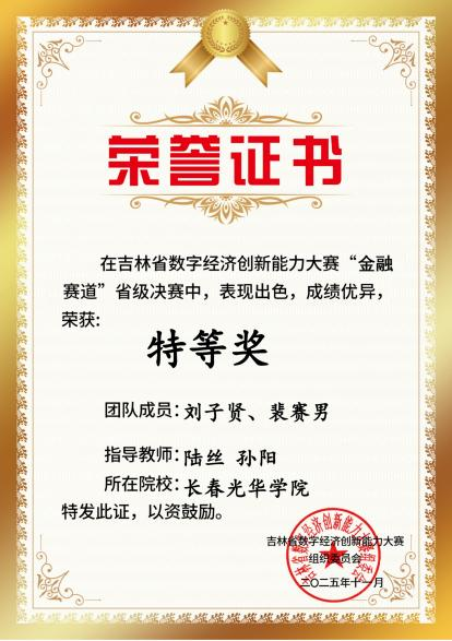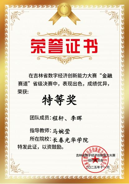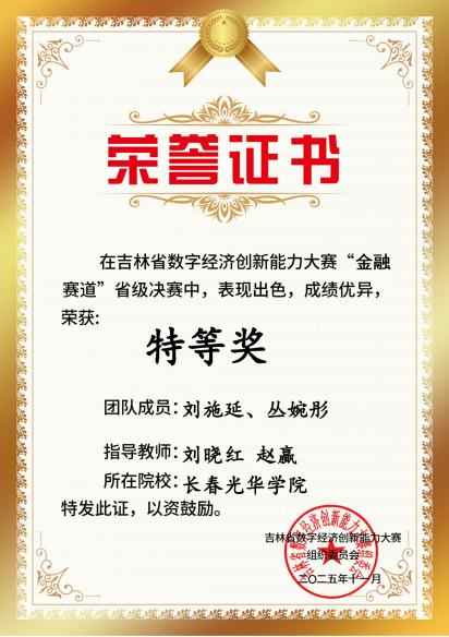 近日,2025 年吉林省数字经济创新能力大赛金融赛道圆满落幕。我校商学院积极组织学生参赛,围绕金融数据解读、逻辑分析、合规应用等核心答题任务展开比拼,实现金融理论知识与实操答题能力的深度融合。参赛学子凭借扎实的专业功底、严谨的逻辑思维与高效的团队协作,在全省高校参赛队伍中脱颖而出,斩获 73 项省级佳绩,其中特等奖 8 项、一等奖 16 项、二等奖 21 项、三等奖 28 项,成绩位居全省高校之首。