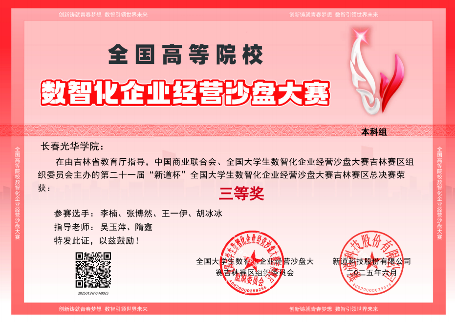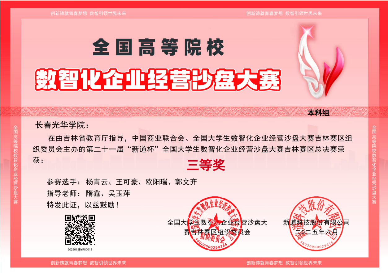 2025年6月7日,第二十一届“新道杯”全国大学生数智化企业经营沙盘大赛吉林赛区总决赛圆满落幕。长春光华学院商学院组成两支代表队在此次大赛中表现出色,荣获省赛三等奖两项。不仅展示了学生的竞技精神和团队协作能力,也彰显了学生对数智化企业经营沙盘的热情。